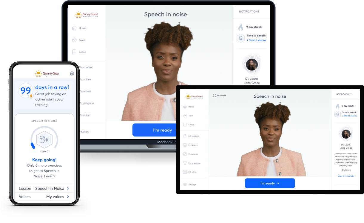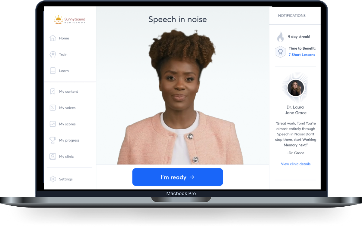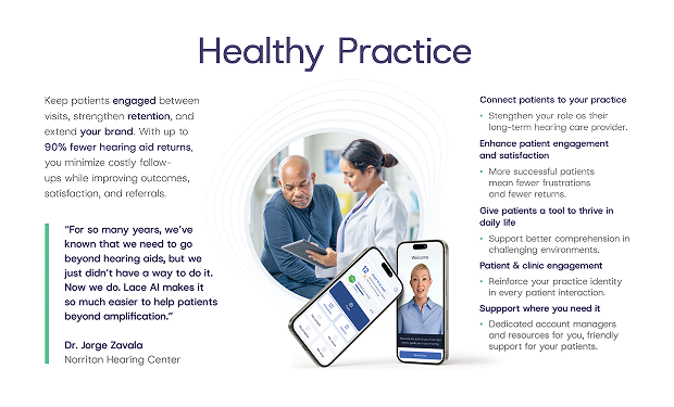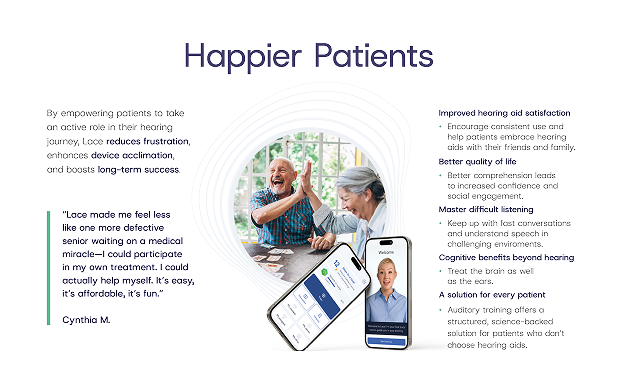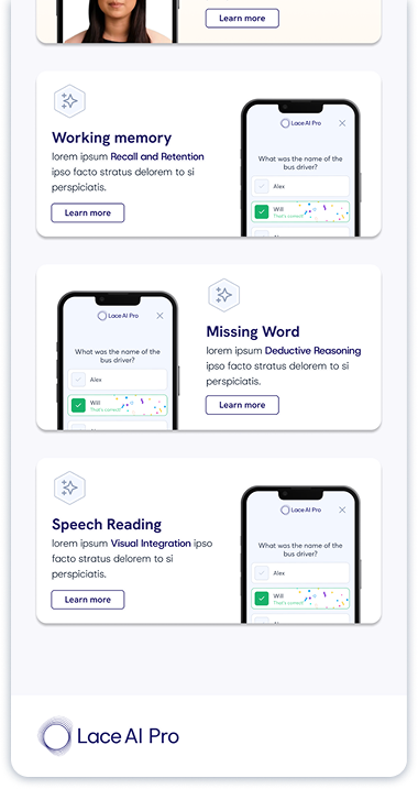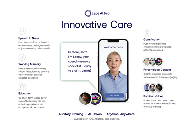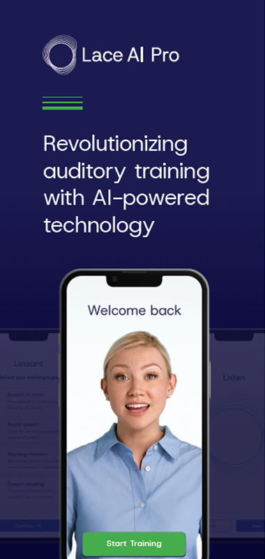 Lace AI Pro is a pioneering auditory training platform that helps people retrain their brains to hear better. Designed for older adults and anyone with hearing loss, its clinically validated software makes auditory training engaging and effective. Popular lessons like Speech in Noise and Working Memory are complemented by unique features such as My Voices, which lets users practice with the voices of family and friends—powered by AI.